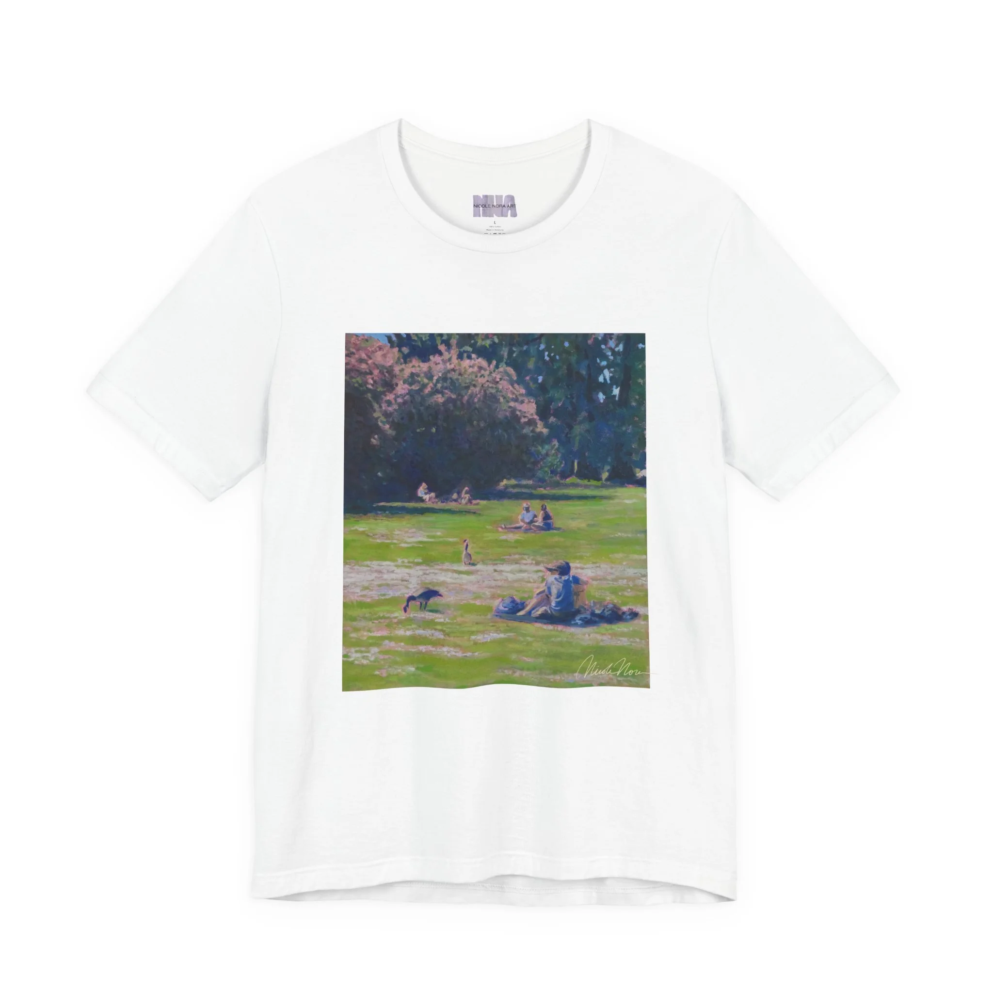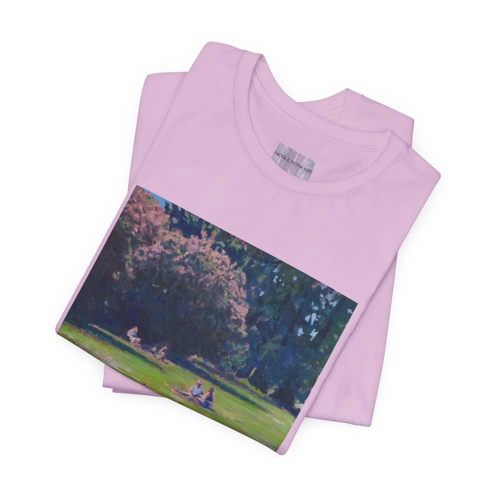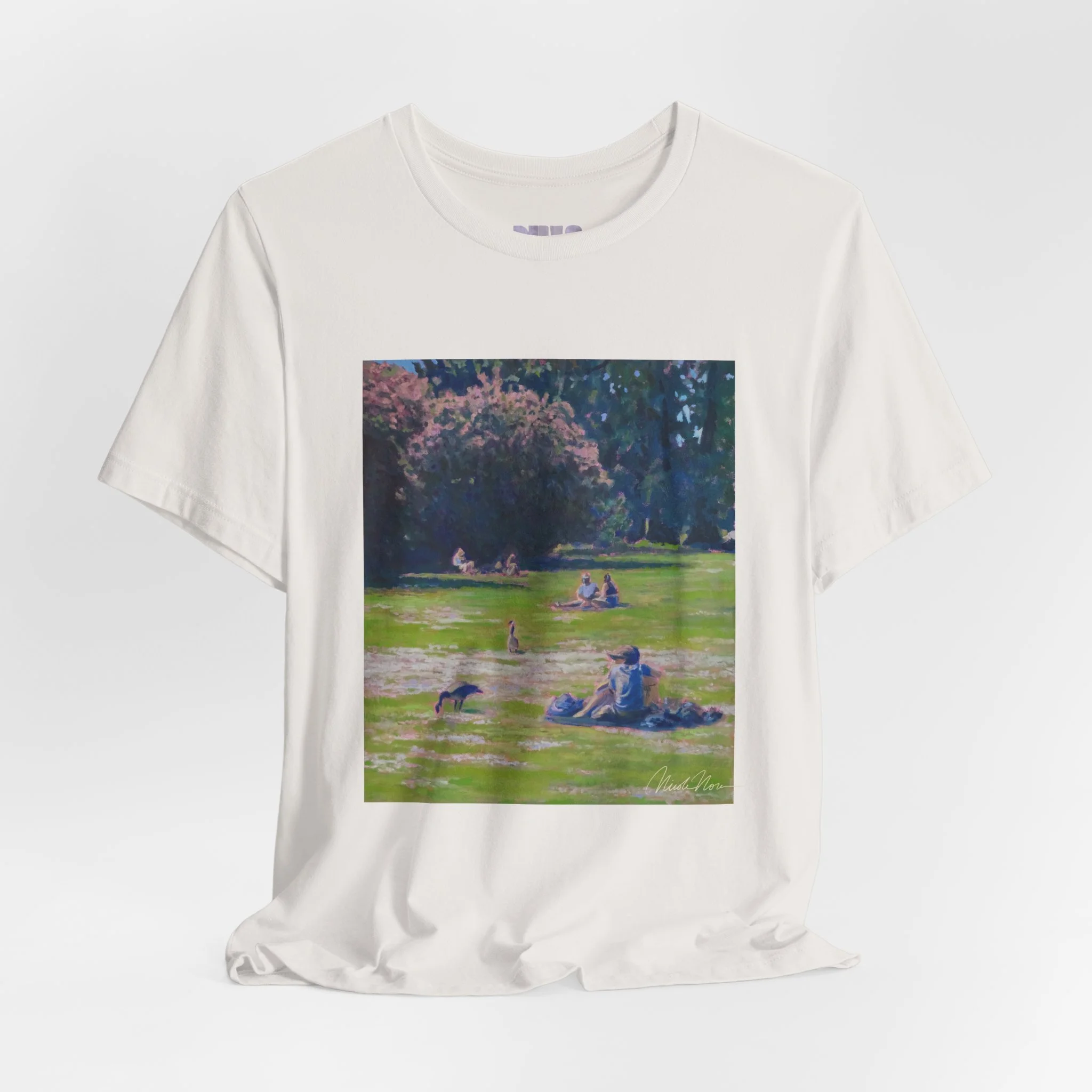 This shirt features my painting called "shared ground" featuring a green lake scene.