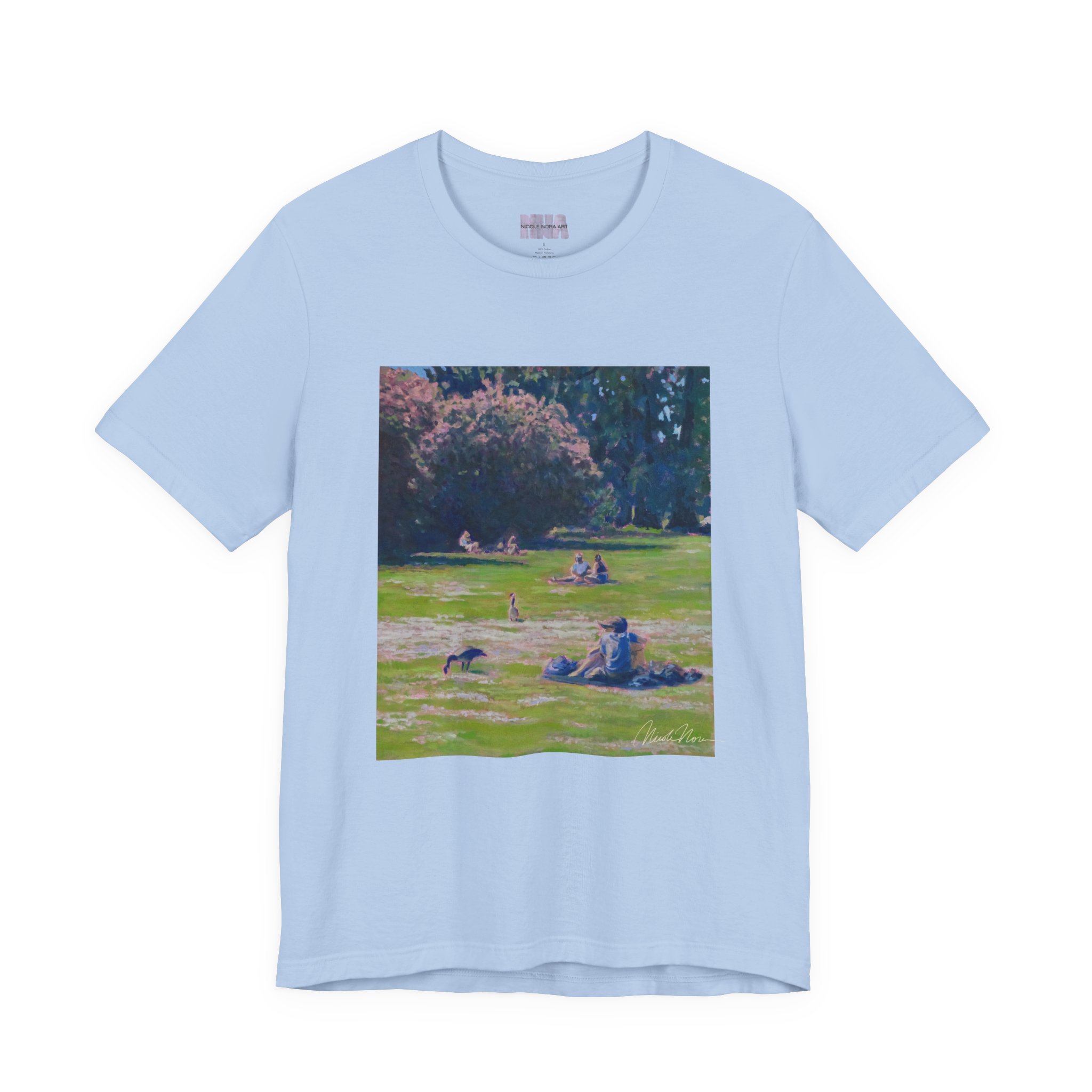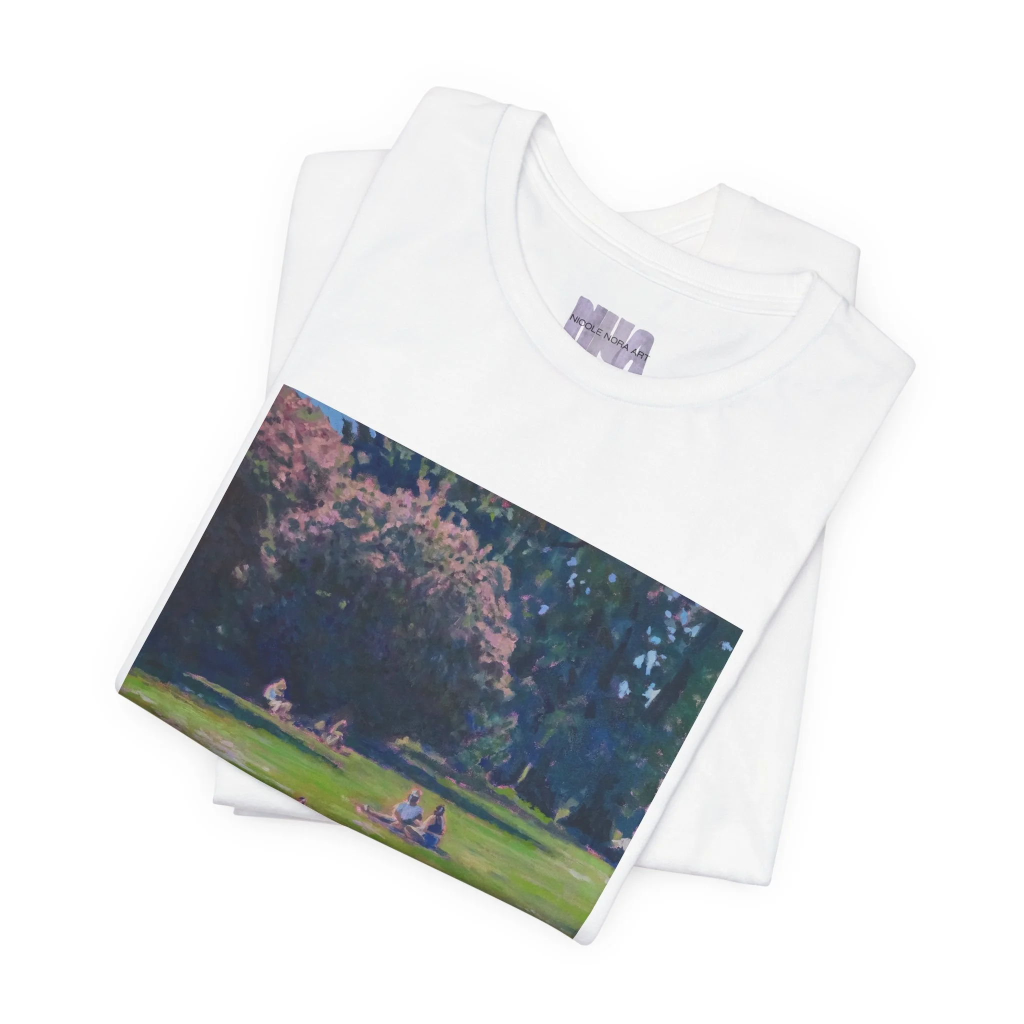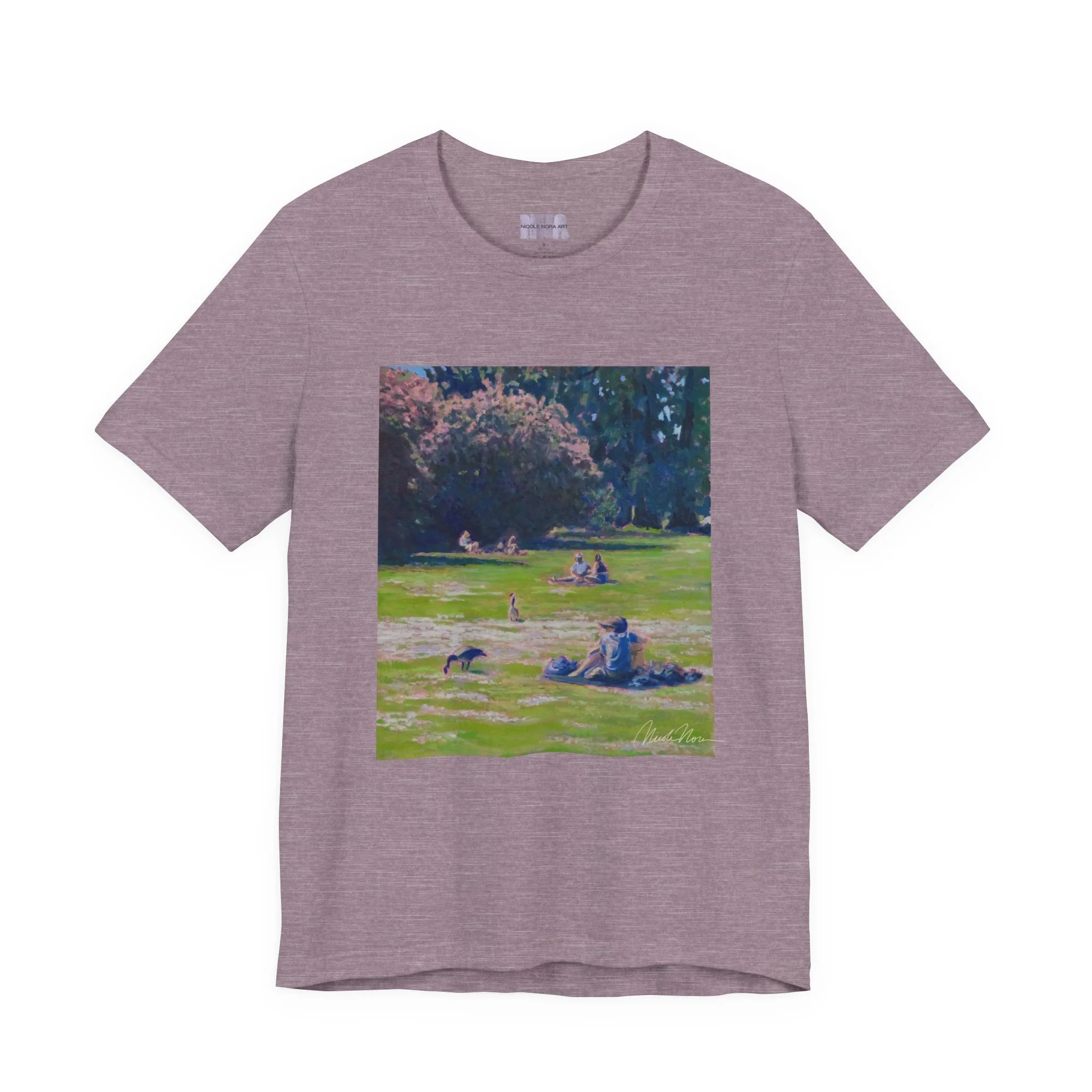 This shirt features my painting called "shared ground" featuring a green lake scene.